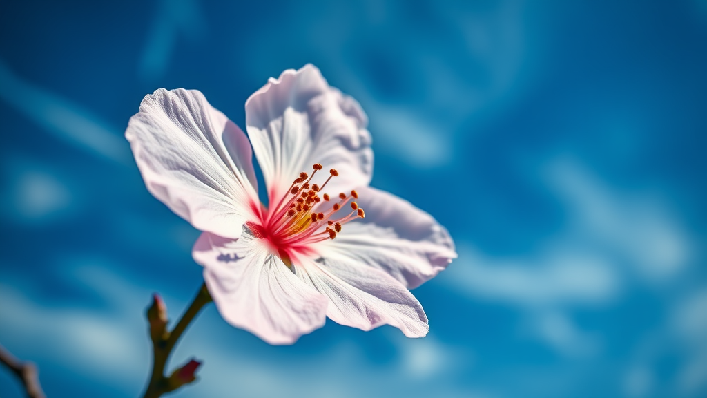 A lone blossom under a cerulean sky with wispy clouds, Miki Asai macro style, ultra-focus, highly intricate, artstation favorite, studio lighting, depth and clarity, featuring layers of detail, reminiscent of Greg Rutkowski's techniques.