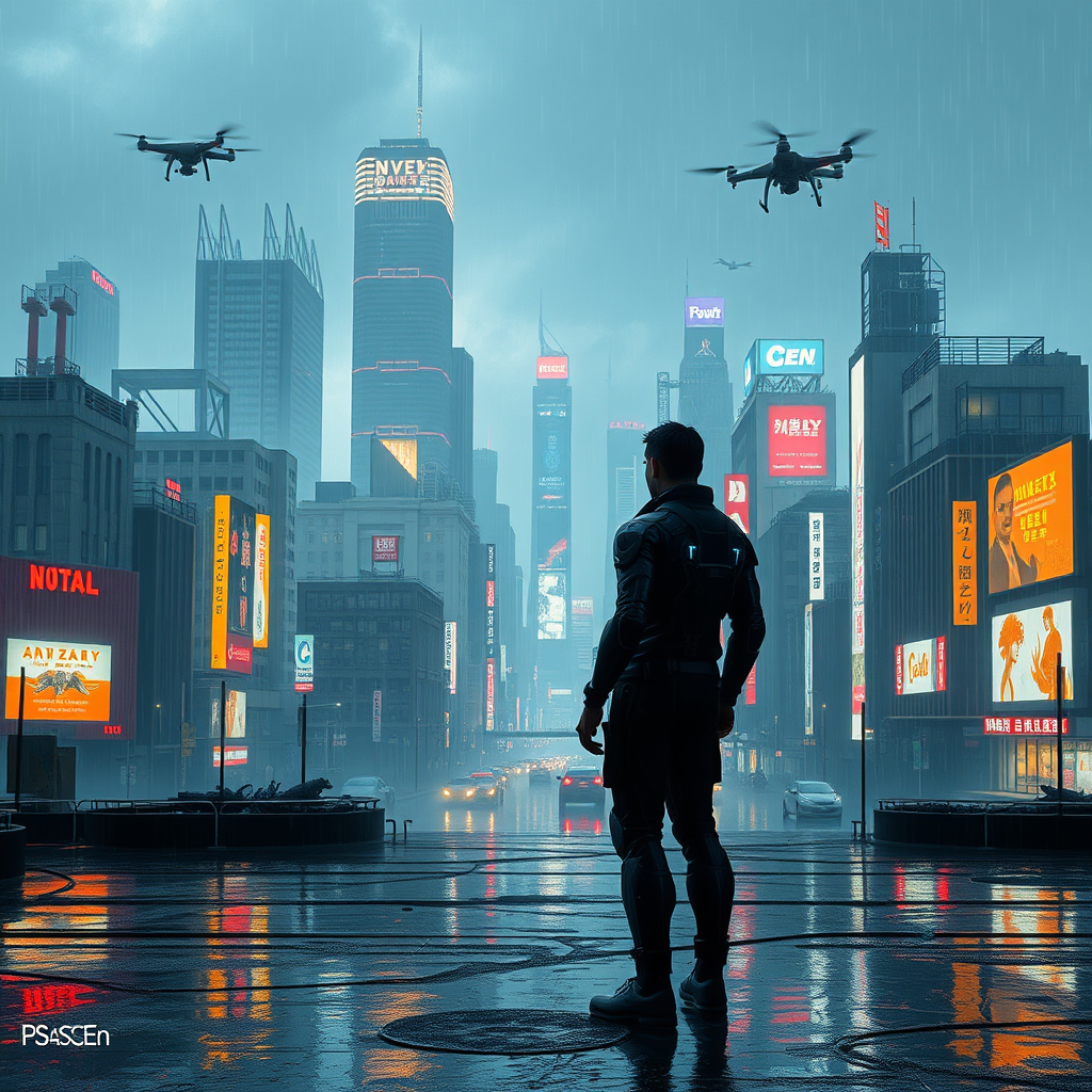 A lone cybernetic hero stands before a sprawling metropolis bathed in neon and shadow, their silhouette outlined against the flickering lights of towering buildings and humming drones that patrol the hazy sky, a testament to both human ambition and the encroaching dominance of technology, as rain falls gently, reflecting a spectrum of glowing advertisements in the puddles beneath.