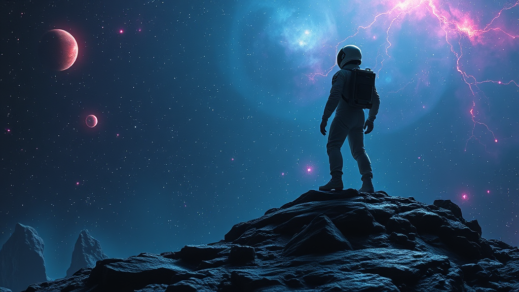 A lone explorer clad in a sleek space suit stands atop a rugged hill, gazing into a mesmerizingly vibrant cosmic expanse. The universe glows with dark neon hues, evoking a sense of wonder and mystery. This image, reminiscent of a legendary metal album cover, captures the essence of dreaming about the vastness of outer space, inspired by the cinematic grandeur of interstellar adventures. The scene is brought to life through digital artistry, featuring a dynamic play of volumetric lighting that enhances its CGI octane-rendered quality. The composition embraces a surreal aesthetic, where reality blurs with imagination, and despite occasional artistic imperfections like extra limbs or disfigured features, it evokes an otherworldly charm. Though details may occasionally appear out of focus or misshaped, the image resonates with an abstract beauty, reminiscent of low-resolution textures and subtle digital artifacts, yet leaving a lasting impression of boundless exploration without the constraints of traditional form.