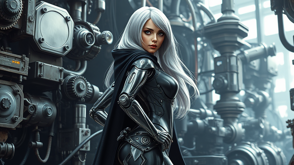 A lone female android stands amidst intricate machinery, her mechanical arms glinting under the soft light. She has flowing silver hair cascading beneath a dark cloak. Her posture exudes confidence, head slightly turned with piercing eyes gazing at the viewer. Her curvy silhouette is accentuated by her stance, with one hand resting on her hip. The air hums with the quiet power of her prosthetics, hinting at stories untold.