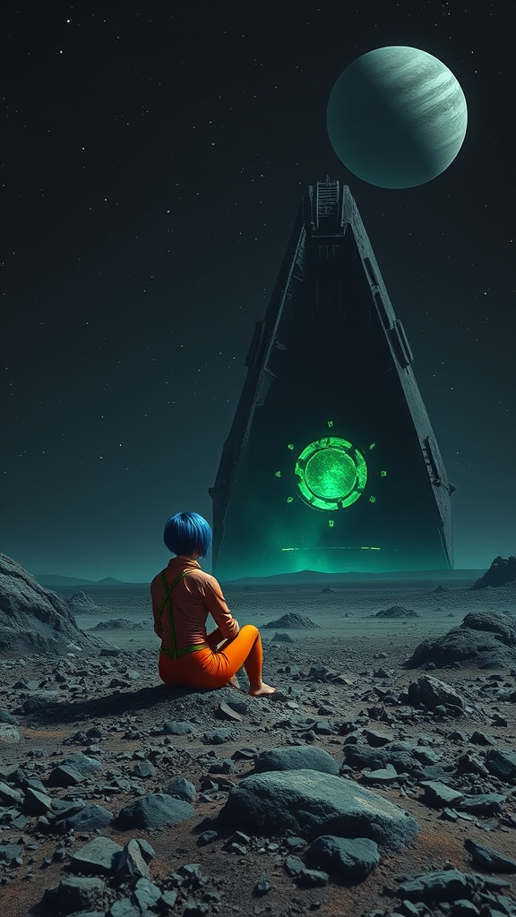 A lone female astronaut with striking blue short hair, seated barefoot on the rocky, desolate surface of a stony planet, gazes contemplatively at the vast, dark sky. Her vibrant orange leggings space suit contrasts sharply with the surrounding desolation. In the distance looms a massive, abandoned spaceship, its dark angular structure partially obscured by shadow. Eerie green energy faintly pulses from within its damaged and fractured hull, hinting at a mysterious, hidden power. The spaceship, with missing panels and jagged edges, speaks of a violent, catastrophic past. Above, the night sky is an endless expanse of deep blacks and blues, punctuated by a few distant stars, underscoring the vast loneliness of the scene. A large, spectral planet hangs in the sky, adding to the sense of otherworldly wonder. The dark color palette, enriched by hints of green, black, and deep blue, emphasizes the mysterious and potentially dangerous aura of this forgotten place, evoking textures and shadows that convey depth and intrigue on this distant, enigmatic world.