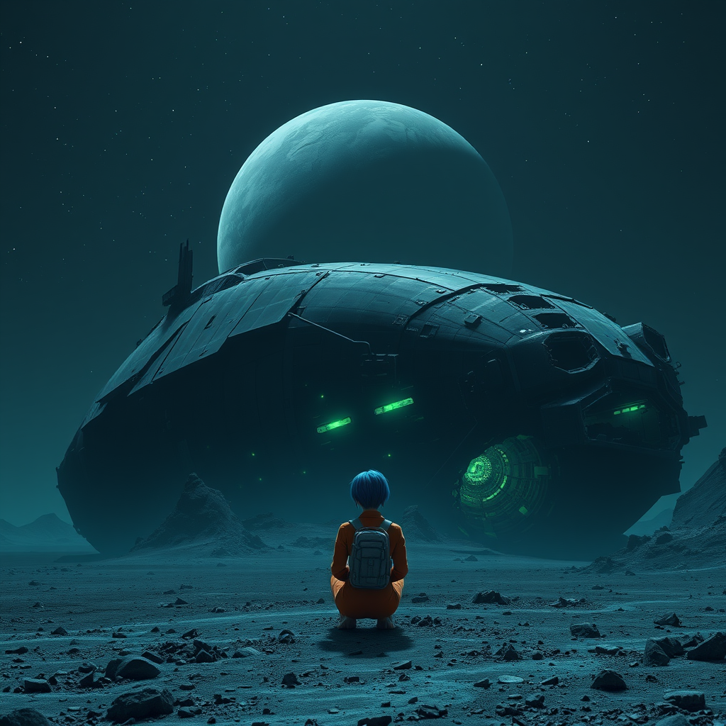 A lone female astronaut with striking blue short hair and an orange leggings space suit sits barefoot, gazing into the vastness of the dark sky on a barren, stony planet. In front of her lies a colossal, abandoned spaceship, its structure dark and angular, emanating faint green energy from its damaged and broken interior. The hull shows significant wear, with several parts missing or shattered, hinting at a catastrophic event long past. The sky above is a deep, foreboding expanse, dotted with only a handful of visible stars, enhancing the sense of isolation and mystery. A massive planet looms in the sky, its presence a silent witness to the desolation below. The scene is engulfed in a dark color palette with subtle highlights of green, black, and dark blue, with detailed textures emphasizing the wear on the spaceship and the rocky surface of the planet. The atmospheric perspective adds depth, capturing the eerie beauty and enigmatic aura of this forgotten place of power.