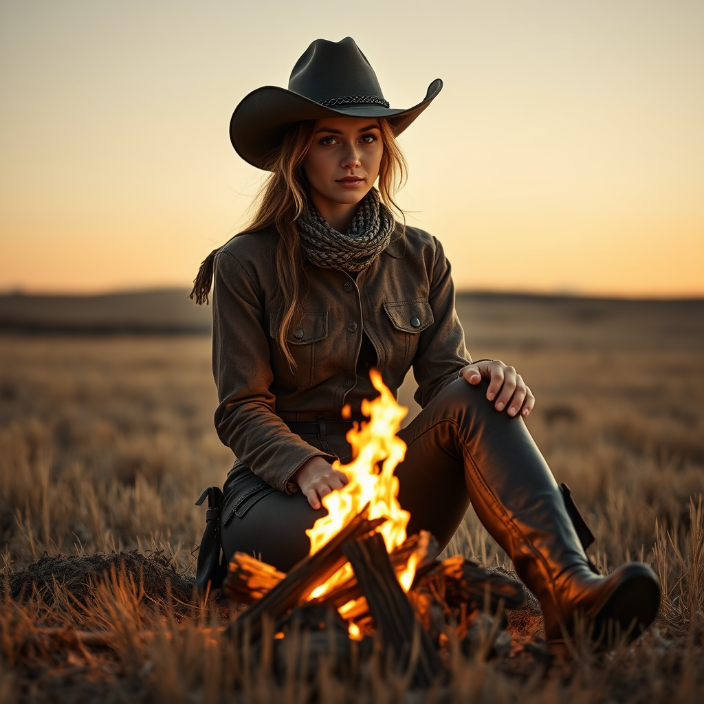 A lone female cowboy sits gracefully by a flickering campfire on the vast prairie, embodying the rugged spirit of the Old West. The scene is a stunning visual, capturing her breathtaking beauty against the backdrop of a cinematic western landscape. The details are exquisite, with the ultra-sharp focus highlighting every nuance of her weathered leather attire and the glow of the fire. Despite the low-resolution borderlands, the composition remains pristine, avoiding any errors or distractions such as missing digits or poorly drawn features. The image is pure, free from imperfections like disfigurement, extra limbs, or awkward anatomy, maintaining clarity and immersive storytelling. There is a timeless quality, unmarred by artifacts, text, or signatures, presenting a flawless snapshot of frontier life. The simplistic beauty of the prairie, combined with the cowboy's serene demeanor, evokes a sense of solitude and strength, a tribute to the enduring spirit of the American West.