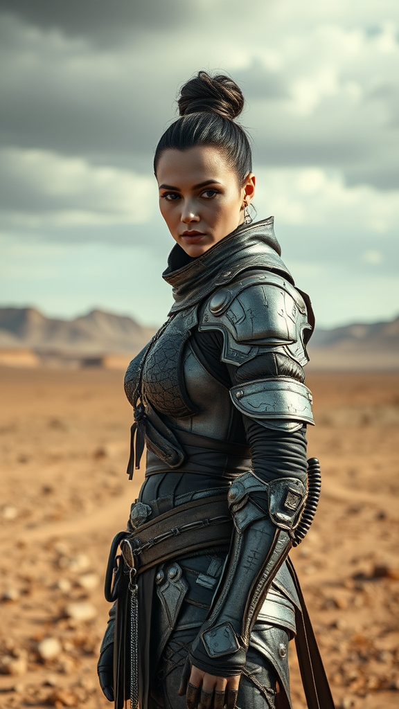 A lone female warrior stands in a barren Martian desert, clad in sleek, futuristic armor of dark silver and bronze hues. Her visage is sharp and determined, her armor adorned with random rivulets and thorn-like textures, embodying the essence of scoutcore. She embodies the avant-garde spirit of the dau al set movement, merging surreal and real-life elements. Her attire features a mix of gleaming metal and rugged leather, echoing the primal elegance of ancient warriors. The stark Martian landscape stretches behind her, a hauntingly beautiful vista under a brooding sky.