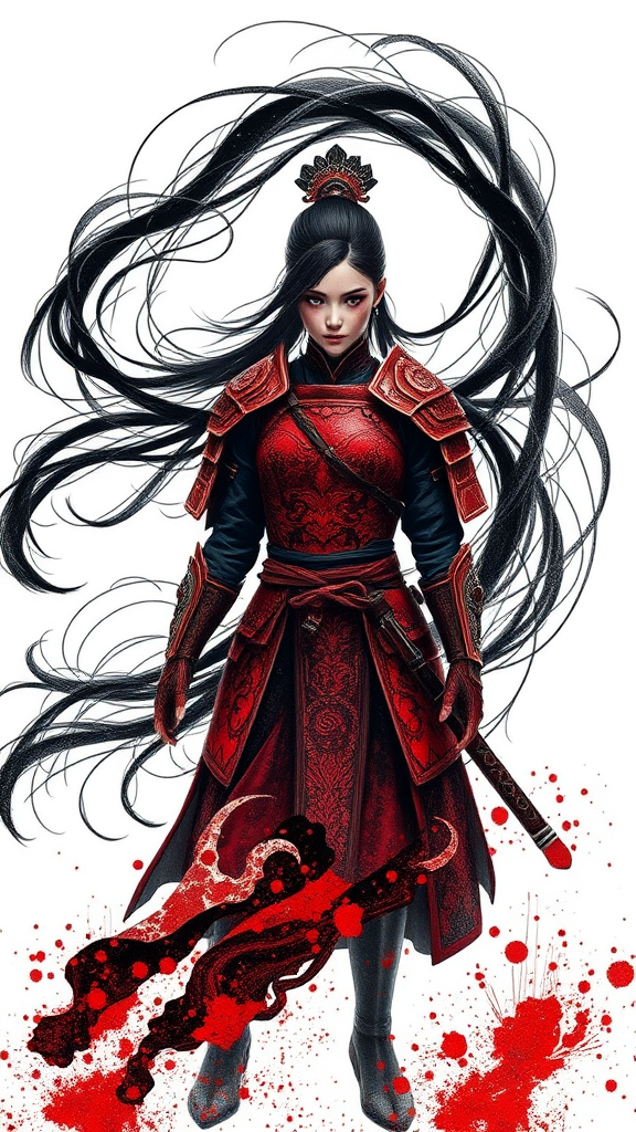 A lone female warrior stands poised against a stark white background, her long black hair swirling around her as if caught in an ethereal breeze. Her intense black eyes lock onto the viewer with a steely gaze. She is clad in striking red armor, intricately designed with fractal patterns that shimmer with a surreal quality. Her face bears traces of blood, adding a fierce and battle-hardened look. She wears traditional tabi on her feet, adding a touch of historical elegance. Her arms are protected by sleek arm guards, completing her warrior attire. This image is an ultra-realistic masterpiece, capturing every detail in high-definition clarity, reminiscent of an abstract ink wash painting with an intricate, detailed CG unity aesthetic, making it an exceptionally high-quality 8k wallpaper.