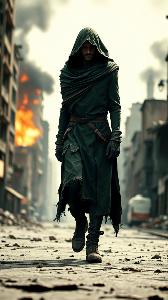 A lone figure adorned in a tattered green cloak strides purposefully forward as the city blazes in chaos behind him. The backdrop of ruinous buildings hints at a world on the brink, yet he walks with majestic assurance. The scene carries a distinctive lo-fi aesthetic, reminiscent of vintage 3D renders with subtle imperfections and blurring that add to its mystique. Shadows play across his indistinct features, giving him an enigmatic presence. Despite the abstract elements and a monochrome palette that portrays the scene in a hauntingly stark manner, the essence of determination and resilience is unmistakable. His form may be slightly distorted, echoing a dreamlike quality, but his purpose is clear amid the apocalyptic tableau.