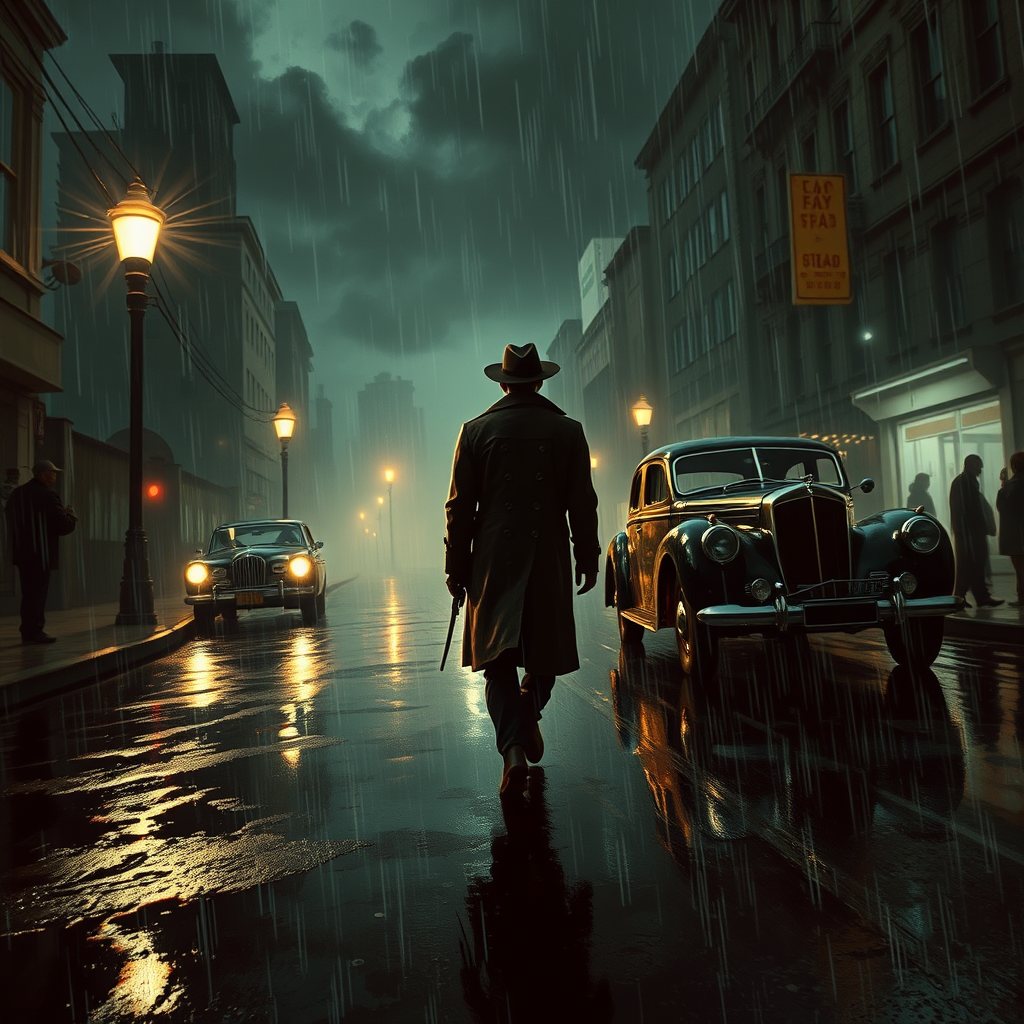A lone figure clad in a trench coat and a fedora strides down a rain-slicked street, with dim streetlights casting reflections on wet pavement. A vintage car follows quietly in the shadows, headlamps softly illuminating the misty air. The scene exudes the essence of Ben Templesmith's noir-infused, cyberpunk art, with an emphasis on neo-figurative style. The saturated atmosphere and gritty textures convey a world on the edge of dystopia—where reality distorts with disfigured perceptions. Dark clouds loom overhead, adding heaviness to the air, while abstract patterns pulse like digital glitches through the urban backdrop. It's a realm where anomalies—mutated silhouettes and extraneous limbs—meld seamlessly with the grim aesthetic. The scene, though visually chaotic and blurred, evokes a sense of haunting allure, reminiscent of a bygone era yet strangely futuristic. Imperfections, such as elongated forms and misshapen features, contribute to a surreal vision colored in monochrome tones, adding an air of mystery that draws one deeper into its noir narrative.
