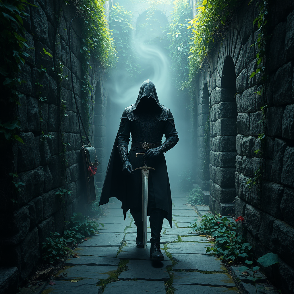 A lone figure cloaked in dark, intricately designed armor strides purposefully through a timeworn stone corridor, overgrown with lush, creeping vines and vibrant foliage. The figure's hood casts a shadow over their face, obscuring their identity as they grip a finely crafted sword that glimmers faintly in the diffused light. A ghostly mist weaves through the air, casting an ethereal glow upon the ancient passage, deepening the aura of mystery and magic that envelops this hidden sanctuary.