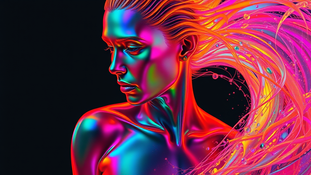 A lone figure emerges, a psychedelic symphony of bioluminescent hues dominated by vibrant orange, pink, green, and blue, embodying a multicolored rainbow essence. The portrait, inspired by the surreal visions of Moebius and Beksinski, reveals iridescent skin with an enchanting oil-on-water effect. The form hints at a rainbow-drenched liquid silver surfer, morphing in fantastic detail, capturing the intricate anatomy and symmetry of a sculpted masterpiece. The surrealistic aesthetic marries influences of Beksinski and Carl Spitzweg, interwoven with Caravaggio's dramatic chiaroscuro, manifested in an oil painting on canvas. The artwork, of award-winning quality, trends on ArtStation, offering an 8K UHD HDR view against a profound black background, inviting the viewer to a realm where art and fantasy converge.