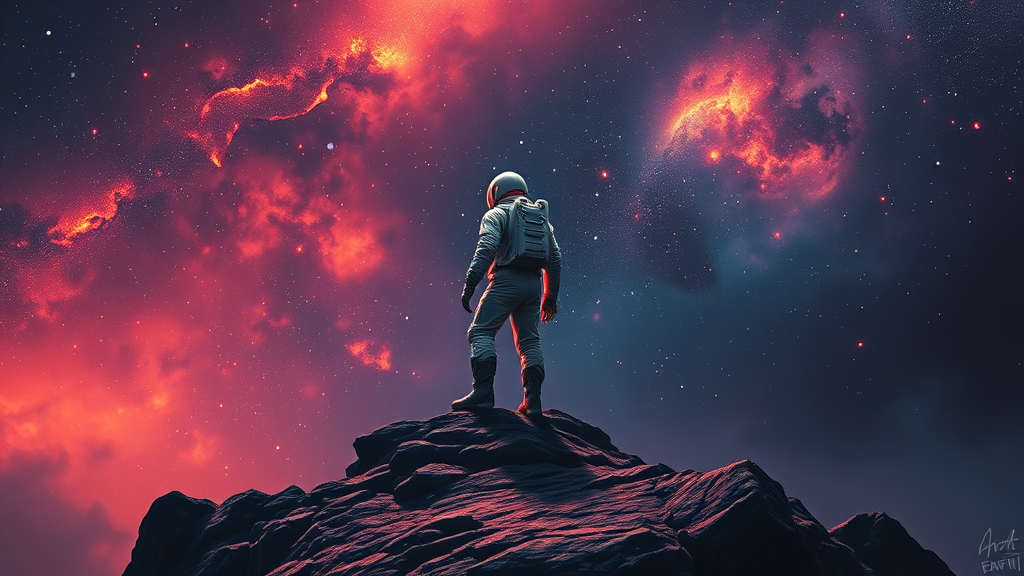 A lone figure in a space suit stands atop a rugged hill, enveloped by a vibrant, dark neon-lit universe. This digital painting, inspired by the aesthetic of metal album covers, evokes dreams of the cosmos and echoes the grandeur of the interstellar film genre. Featuring volumetric lighting and rendered with CGI techniques, the scene captures a surreal blend of realism and artistic imagination. Despite hints of low resolution or visual imperfections reminiscent of distorted JPEG artifacts and subtle signatures, the composition maintains its magnetic allure. The figure's anatomy may appear slightly unconventional, with abstract hints of extra limbs or fingers, contributing to a disfigured, otherworldly charm. Cropped and framed in an intentionally skewed perspective, this piece embraces an avant-garde, offbeat beauty that challenges traditional artistic norms.