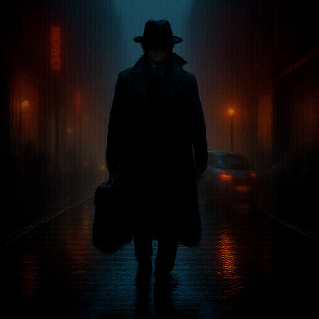 A lone figure in a trench coat and hat strides down a dimly lit street, rain cascading in sheets, and a sleek car trailing silently behind. The scene is saturated with rich, neon hues reflecting off wet pavement, evoking a blend of noir and cyberpunk aesthetics. The artwork channels a neo-figurative style reminiscent of Ben Templesmith, with a focus on moody atmospheres and gritty details. The character's features are intriguingly abstract, deliberately exaggerated and surreal, while striking a balance between the bizarre and the alluring. The environment is bustling yet ambiguous, blurring the lines between reality and illusion. The textures appear gritty and tactile, with deliberate imperfections that enhance the overall aesthetic—a testament to the captivating chaos of a futuristic cityscape devoid of clarity and traditional beauty.