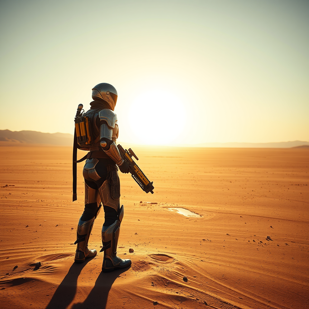 A lone figure stands as a beacon of order in a vast, open desert landscape, a fierce yet serene peacekeeper of a futuristic post-apocalyptic world. Clad in intricately forged armor that glistens under the blazing sun, they hold a cutting-edge energy rifle, its sleek design hinting at advanced technology far beyond our time. The expanse around them stretches infinitely, a testament to their daunting duty of maintaining harmony amidst chaos. The scene unfolds in cinematic splendor, each detail captured in stunning HDR and 8k resolution, weaving a tale of resilience and strength.