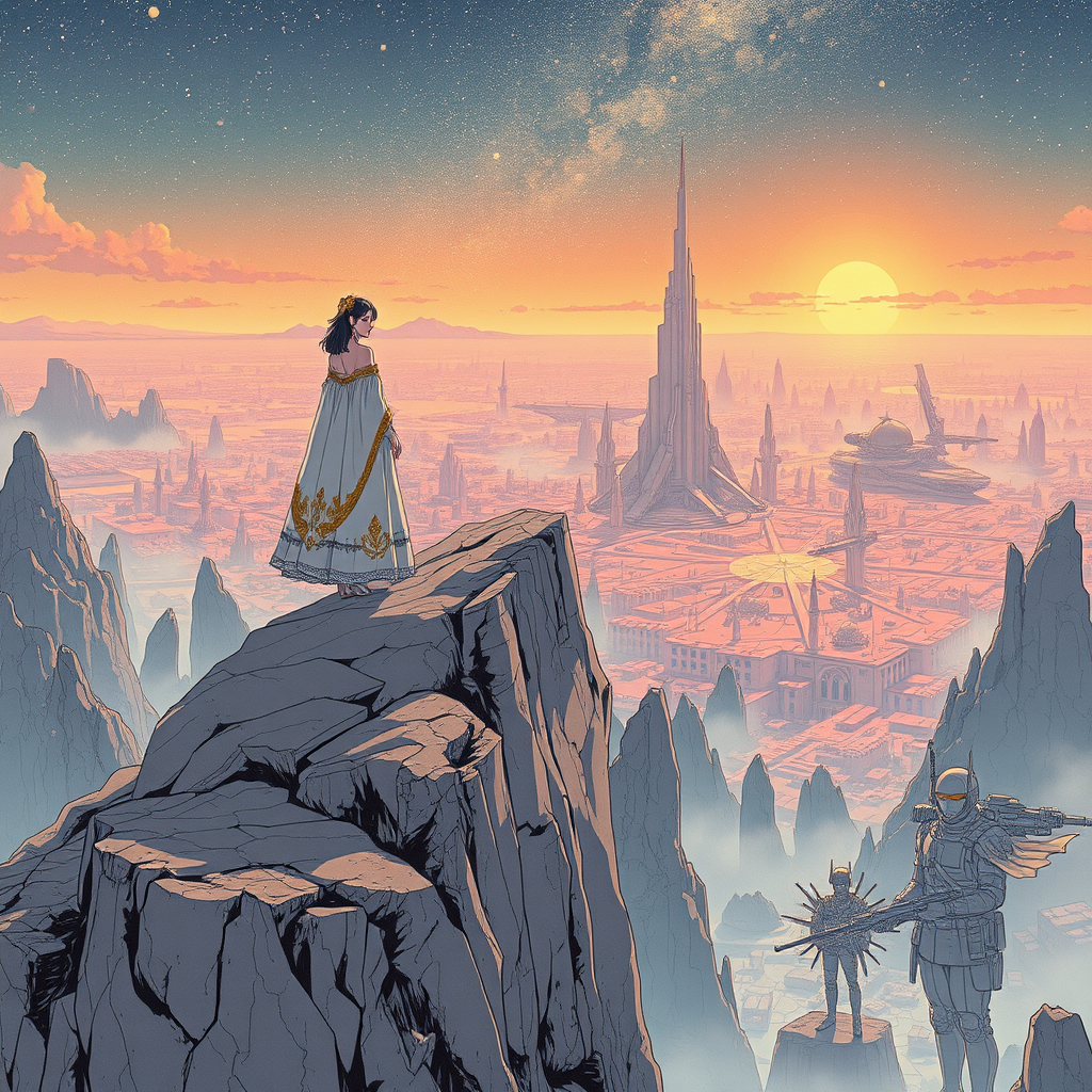 A lone figure stands atop a craggy rock, silhouetted against a sprawling, ethereal landscape reminiscent of Moebius’ colorful worlds. The scene is imbued with a cyberpunk manga vibe, intertwining futuristic cityscapes in the distance. The figure's attire blends white and gold, exuding a sense of romanticized femininity and elegance, with intricate patterns adding a lavish touch. Nearby, meticulous military scenes unfold, contrasting the serene solitude of the rock. Delicate inlays gleam subtly, capturing the light from distant stars in a vast space art backdrop, creating an otherworldly ambiance.