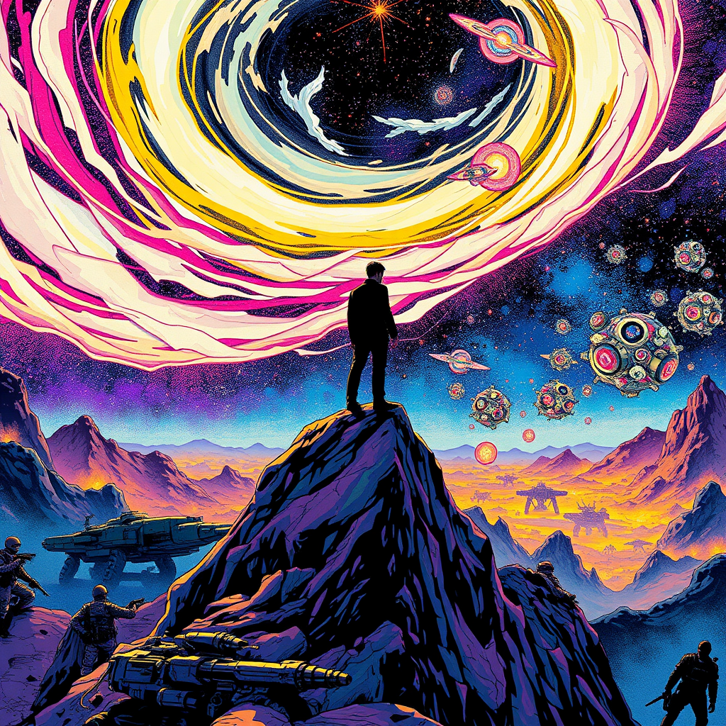 A lone figure stands atop a jagged rock, enveloped in a swirling kaleidoscope of colors reminiscent of Moebius' artwork, amid the neon glow of a cyberpunk landscape. The sky is painted in bold strokes of white and gold, casting an ethereal light that bathes the scene in romanticized femininity. Below, a meticulously detailed military scene unfolds, with troops and machinery rendered in intricate inlay patterns, revealing the tension and artistry of a spacefaring civilization. Above, the vast cosmos stretches infinitely, filled with clusters of vibrant, otherworldly objects, highlighting the boundless exploration of space. The man's silhouette is one of determination and quiet reflection, merging seamlessly with the vivid hues and intricate details that define this unique blend of styles.