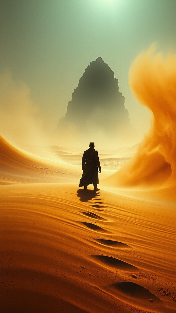 A lone figure stands defiantly in a vast desert landscape, surrounded by swirling volumetric sand illuminated by intense, dramatic lighting. The immersive background is bathed in global illumination, highlighting the intricate details of the scene. The high detail digital painting captures a realistic yet stylized environment, with muted colors and a gritty palette that evokes a sense of solitude and tension. Rendered in ultra high resolution with physically-based rendering, the scene feels almost tangible. The unexpected twist: a shadowy mirage appears on the horizon, adding an element of surreal mystery to the otherwise realistic setting, drawing the viewer deeper into the narrative world's atmospheric tension.