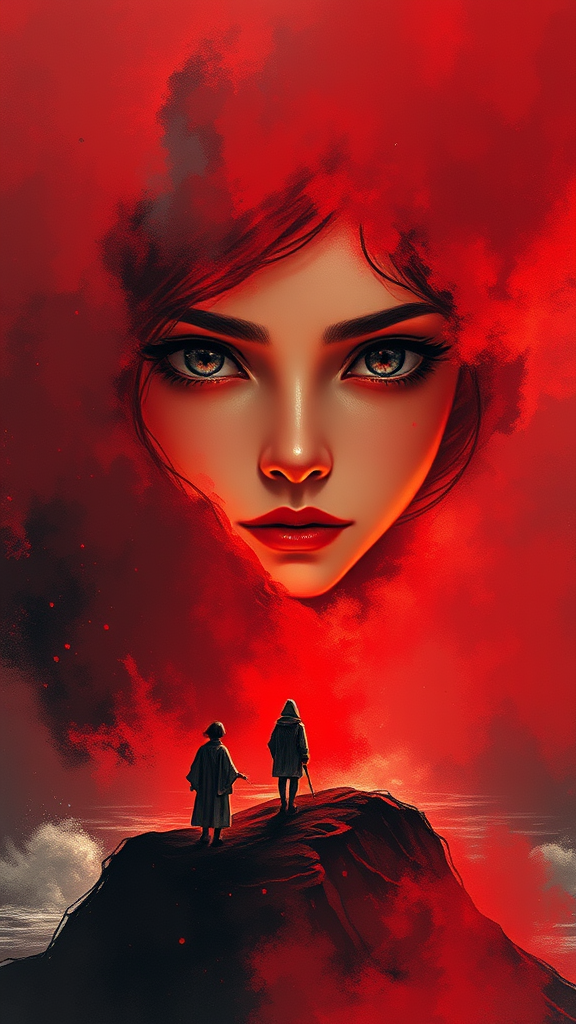 A lone figure stands on a mystical island, enveloped in an aura of dark bronze and deep red hues. The scene, reminiscent of kawacy's style, features luminous brushwork that brings an ethereal glow to the intense close-up of the character's expression. Her eyes, filled with irony and wisdom, capture the essence of womancore. Traditional artistic techniques provide a textured, timeless quality, blending seamlessly with the modern vibrancy of the composition's unique color palette. The island's landscape hints at ancient secrets, with whispering winds and mythical shadows creating a mystical atmosphere.