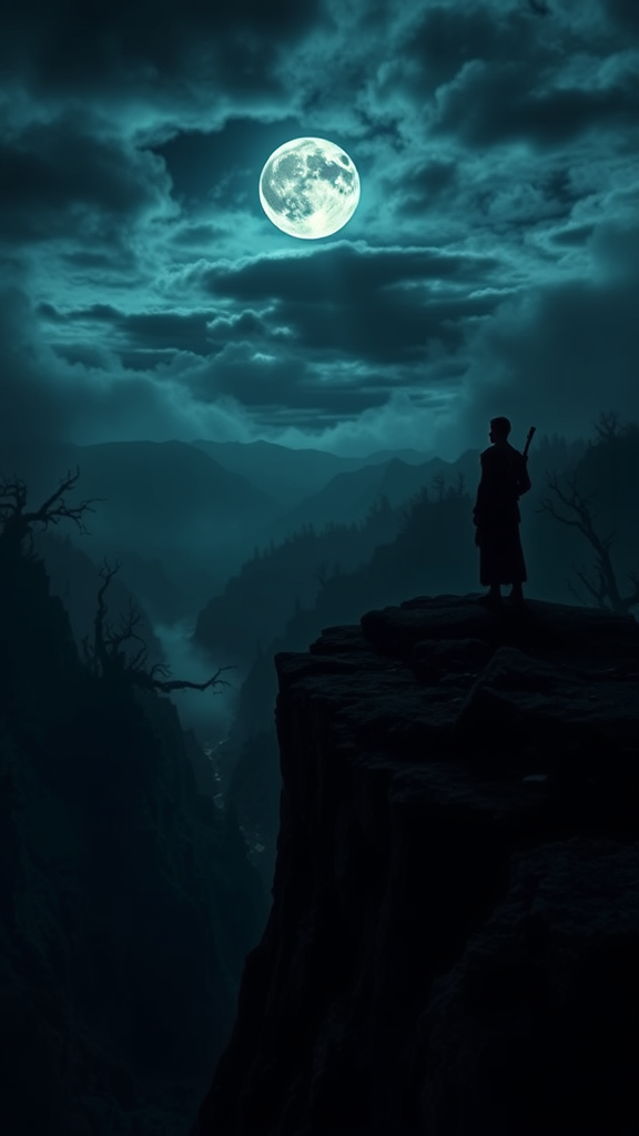 A lone figure stands on a rugged cliff, overlooking a shadowy and foreboding valley. The figure is silhouetted against a tempestuous evening sky, with the full moon casting an ethereal and slightly menacing glow. The valley below disappears into shadow, where twisted trees, jagged rocks, and deep ravines lurk in the obscurity. Mist rises subtly from the valley floor, adding a layer of mystery. The scene is enveloped in a chilling atmosphere, charged with suspense and the unknown, emanating a dark and cinematic mood.