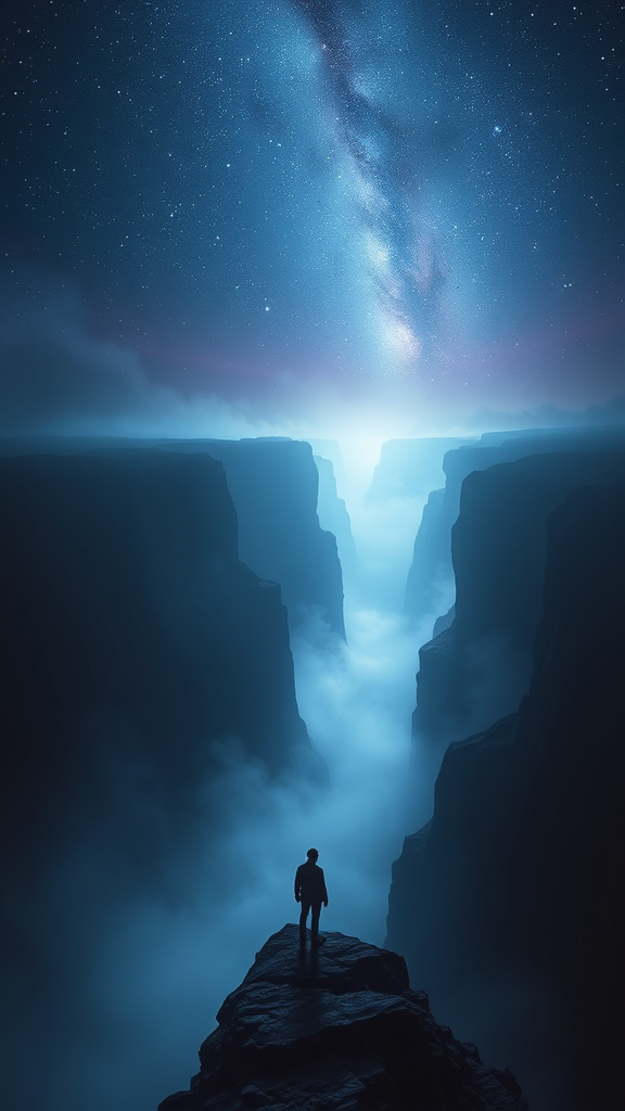 A lone figure stands on the edge of a vast chasm, their silhouette illuminated by ethereal light emanating from the dark depths below. Ancient, swirling mist cloaks the abyss, obscuring the mysteries within. Above, a sky bruised with shades of deep indigo and violet hosts a cascade of distant stars that seem to pulse in rhythm with the figure's heartbeat. The air is charged with a sense of the unknown, a haunting melody carried on the wind that whispers forgotten secrets of the universe. Time seems to stand still as the figure gazes into the void, where shadows dance and dreams of worlds yet unseen beckon from the darkness.