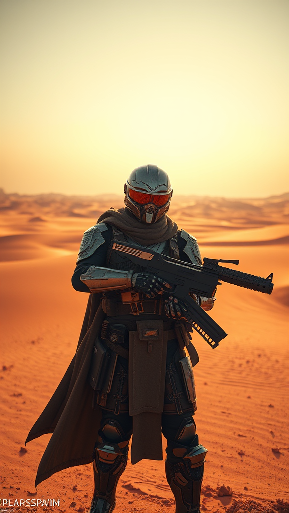 A lone figure stands resolute in a vast, endless desert landscape, part of a futuristic post-apocalyptic security force dedicated to maintaining peace. The character, a seasoned peacekeeper, is clad in intricately forged armor that gleams under the harsh sun, reflecting a sense of strength and resilience. Equipped with a state-of-the-art energy rifle, the weapon hums with a contained power, hinting at advanced technology. The scene is captured in a wide-angle cinematic shot, emphasizing the vast openness of the desert and the solitary nature of their mission. The image is rendered with HDR quality and high-definition clarity, highlighting the details of the armor and the shimmering heat of the desert.