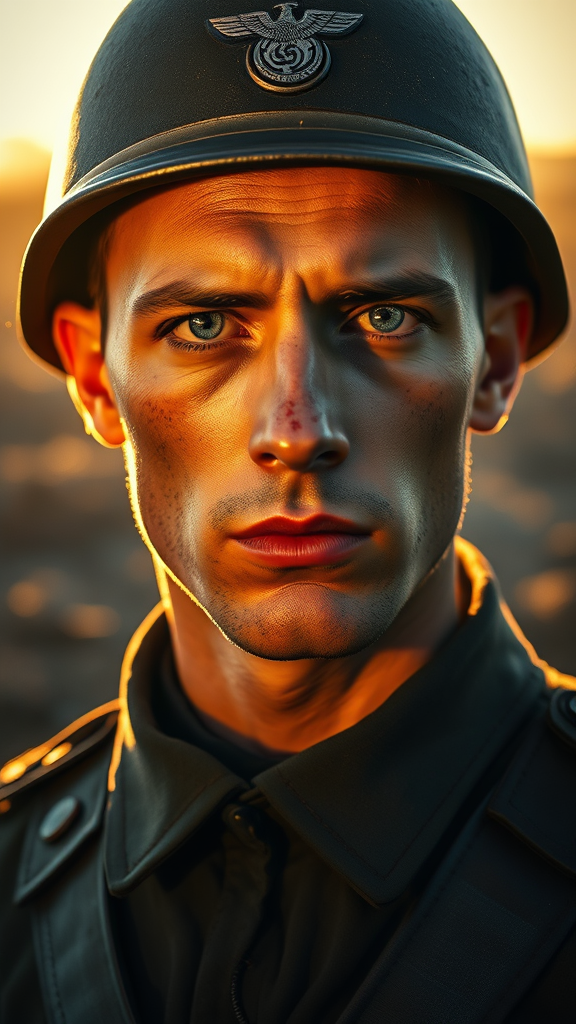 A lone German soldier stands resolute, bathed in warm, soft luminescence, illuminated by the golden hour sun casting a divine glow on his piercing blue eyes, their crystal clarity a testament to the eerily perfect symmetry of his facial structure, an intricate relic of a bygone era as envisioned through the artistic brushstrokes of Joaquin Sorolla - meticulous, detailed, and richly textured, the lighting is both cinematic and surreal, meeting the photographic framing precision of a wide-open 85mm lens, and the environmental context of a picturesque, ravaged landscape reflecting luminous whispers of a bygone world, digitally crafted with the marriage of Hyperrealism and cutting-edge Ocetane rendering techniques, illuminated with a level of photorealistic depth only achieved through careful attention to raytracing.