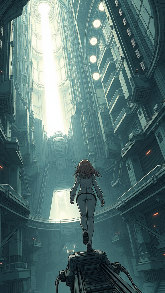 A lone girl clad in a sleek, form-fitting jumpsuit navigates the vast, cavernous interior of a spaceship that echoes the intricate, atmospheric design of Tsutomu Nihei's work, particularly reminiscent of Sidonia no Kishi. The environment displays a sense of gigantism with its towering structures and multi-layered spaces, exuding a highly detailed futuristic, sci-fi aesthetic. At the core is a prominent laser generator, originating a powerful beam that pierces upward towards the heavens, illuminating the interior with energy clots and quick bursts of light. This animated scene captures a sense of acceleration and extreme speed, rendered in hyperdetail with a focus on dynamic manga-style graphics. The drawing is presented in a first-person perspective, offering an immersive experience in stunning 8K HD super-resolution, combining anime and graphic novel artistry.