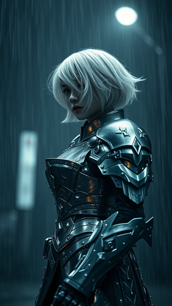 A lone girl clad in intricate Gundam-inspired armor stands in the midst of a dark, rainy night. Her short white hair billows gently in the wind, creating a striking contrast against the stormy background. The scene is a visual masterpiece, capturing extreme detail and a cinematic feel. The shiny armor reflects the scant light, creating a surreal and divine atmosphere reminiscent of both anime and celestial influences. The environment is stunning, a blend of photography and CGI elements that elevate the composition to a 3D doll-like render. The image evokes a sense of solitude and strength, embracing a manga and anime aesthetic, showcased in trending art styles.