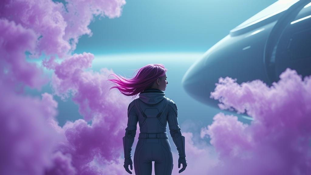 A lone girl in a futuristic space suit stands in the void of space, her striking pink hair flowing in zero gravity. She is surrounded by the imposing form of a sleek spaceship, its metallic surface reflecting cinematic light. Billowing purple smoke envelops her as she gazes into the distance. The scene is captured with a sharp, photorealistic detail, enhanced by the capabilities of Unreal Engine 5, creating a mesmerizing play of reflections and light across the suit and ship, underscoring the vastness and isolation of space exploration.