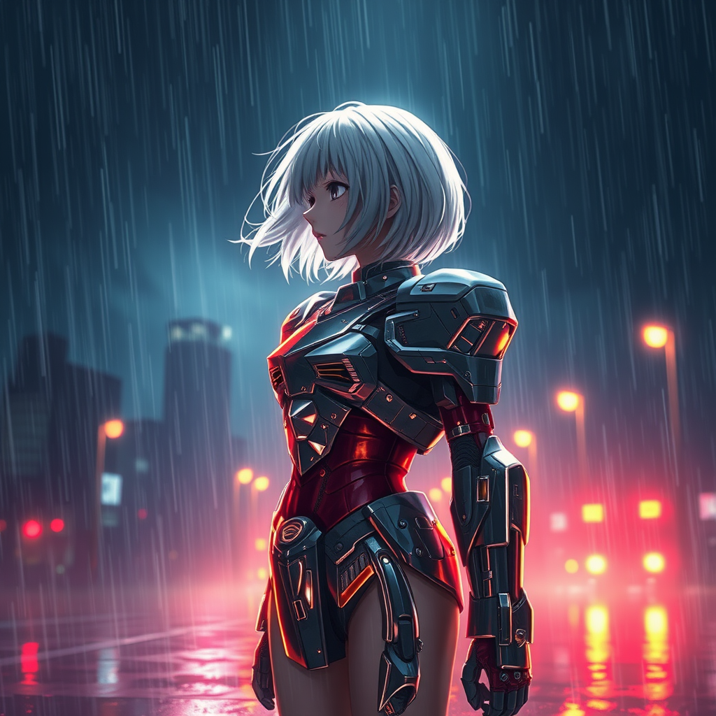 A lone girl stands amidst a dark, rainy night, her short white hair flowing in the wind. She is clad in gleaming Gundam armor, its intricate details shimmering in the cinematic glow of distant lights. The environment around her is a stunning blend of surreal and divine elements, capturing a celestial atmosphere that feels both otherworldly and familiar. The scene is painted in vibrant, rich colors, with lens flares adding a dynamic touch to the setting. The high-resolution, hyperrealistic quality, reminiscent of a masterpiece rendered in Unreal Engine 5, brings an unparalleled depth to the image. The environment's glowing reflections and intricate details create a cinematic and photographic brilliance, akin to high-quality art often trending on platforms like ArtStation. The scene captures a blend of 3D CGI hyperrealism and anime aesthetics, presenting a focused, elaborate portrayal of the solitary figure.