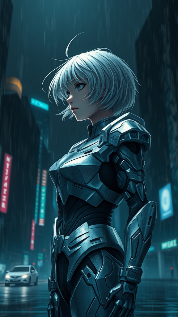 A lone girl stands amidst the stormy cityscape, clad in intricate Gundam-inspired armor. Her short, white hair flows gently in the wind, contrasting with the dark, rain-soaked night. The atmosphere is surreal and cinematic, embodying a celestial ambiance that captures the essence of a masterpiece. She exudes a divine presence, her armor gleaming with a polished, smooth finish, reflecting the dramatic lighting of the environment. The imagery channels the aesthetic of detailed anime CGI and ultra-realistic 3D rendering, akin to a stunning work trending on art platforms. Despite the darkness and solitude, there is an ethereal beauty to the scene, reminiscent of a dystopian dreamscape where the line between human and machine blurs, forming a hauntingly exquisite portrait.