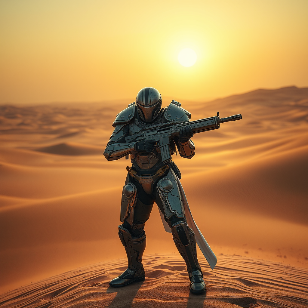 A lone guardian in a futuristic post-apocalyptic desert landscape, serving as a vigilant peacekeeper under the relentless sun, stands amid endless dunes. Encased in intricately forged armor that gleams with a metallic sheen, they wield a sleek, advanced energy rifle. The horizon stretches in a cinematic, wide-angle view, capturing the vast expanse of the open desert terrain. The vivid HDR rendering highlights the contrast between the guardian's armor and the rugged environment, enhancing the scene with meticulous detail in 8k resolution.