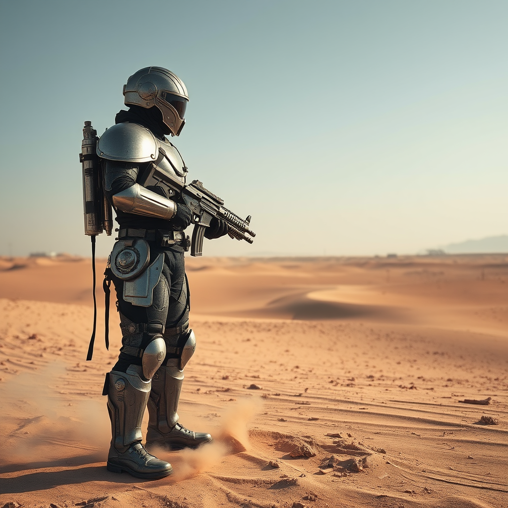 A lone guardian stands resolute in the vast expanse of a post-apocalyptic desert, serving as the last line of defense in a futuristic security force. This peacekeeper, clad in intricately forged armor, surveys the barren landscape through a wide-angle lens. The metallic sheen of their protective gear glistens under the harsh sun, a testament to the advanced technology of this era. In their hands, an energy rifle crackles with latent power, ready to maintain the fragile peace of the open desert. The scene unfolds in cinematic grandeur, captured in stunning HDR and rendered in breathtaking 8k resolution. Dust swirls around their sturdy boots, whispering tales of forgotten civilizations as they stand vigilant against the backdrop of endless dunes and a foreboding horizon.