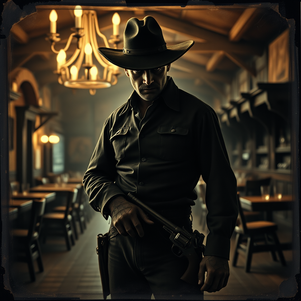 A lone gunslinger stands in a rustic saloon from the 1880s, his silhouette framed by the flickering light of a dusty chandelier; his weathered hat casting a shadow over piercing eyes. The creaky wooden floor and the clinking of glasses set the scene. His hands, skilled and ready, rest near the six-shooter on his hip. The mood is captured with the timeless allure of a tintype photograph, evoking an era where legends walked the dusty trails and tales of daring duels were born.