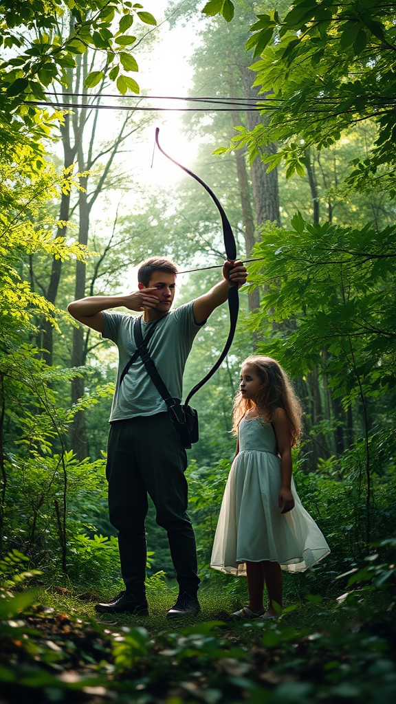 A lone hunter stands tall in the heart of a verdant forest, his bow drawn with precision, creating a portrait of symmetry amidst the lush greenery. The dense foliage serves as a vivid backdrop, highlighting his focused stance at the center of the frame. Beside him, a girl in a flowing dress mirrors his poise, her presence adding a delicate contrast to the robust wilderness. The sunlight piercing through the canopy above bathes the scene in a soft, ethereal glow, merging the strength of the hunter and the grace of the girl into a harmonious tableau within this serene woodland setting.