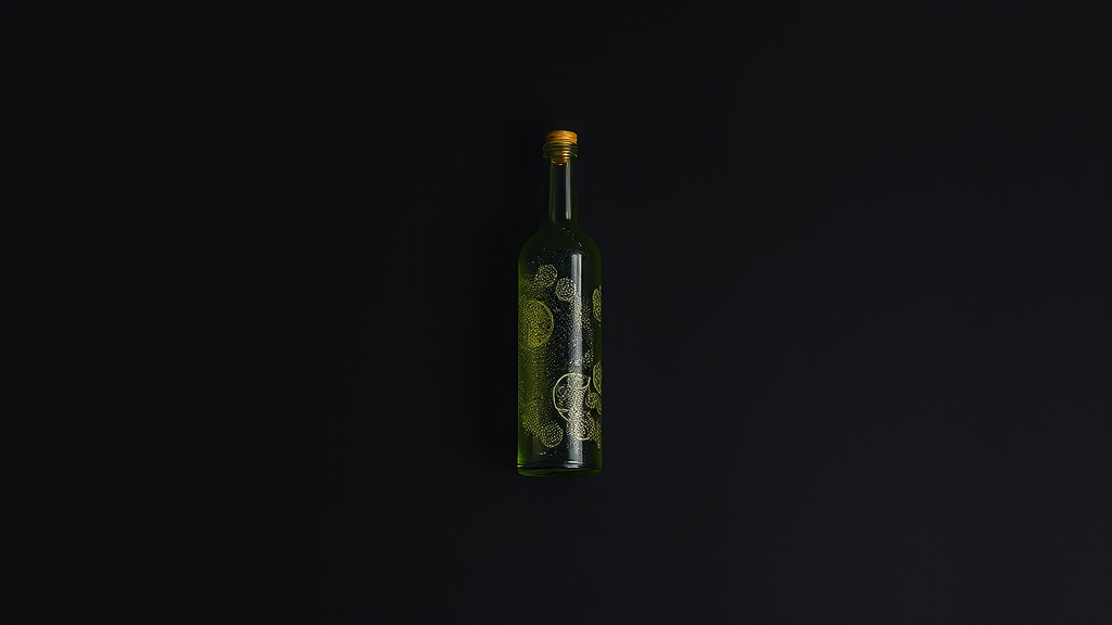 A lone, illuminated bottle on a dark background, showcasing intricate designs glistening on its surface; the bottle's shadow stretches gently on the black canvas, revealing subtle textures and reflections. The scene is captured with a raw aesthetic, emphasizing the delicate play of light and shadow in the elongated, vertical composition.