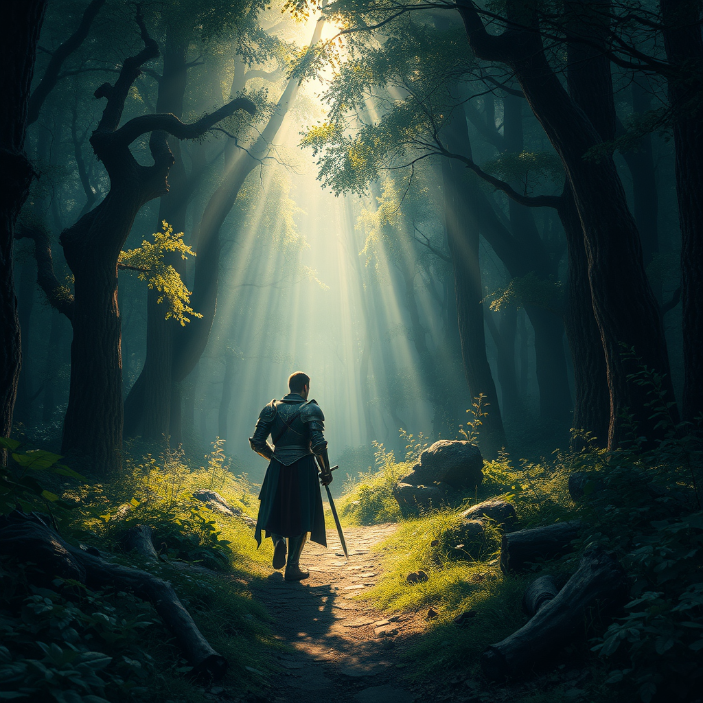 A lone knight meanders through a lush forest landscape, clad in shining armor that catches the soft rays of sunlight piercing through the dense canopy. The scene is set in a captivating medieval fantasy world, brought to life with intricate details and a cinematic flair. As the knight pauses to take in the surroundings, the mystical ambiance of this rich RPG realm envelops him, drawing the viewer into a masterpiece of digital art. The vivid textures and highly detailed elements create an enchanting atmosphere, inviting the imagination to explore further into this medieval saga.