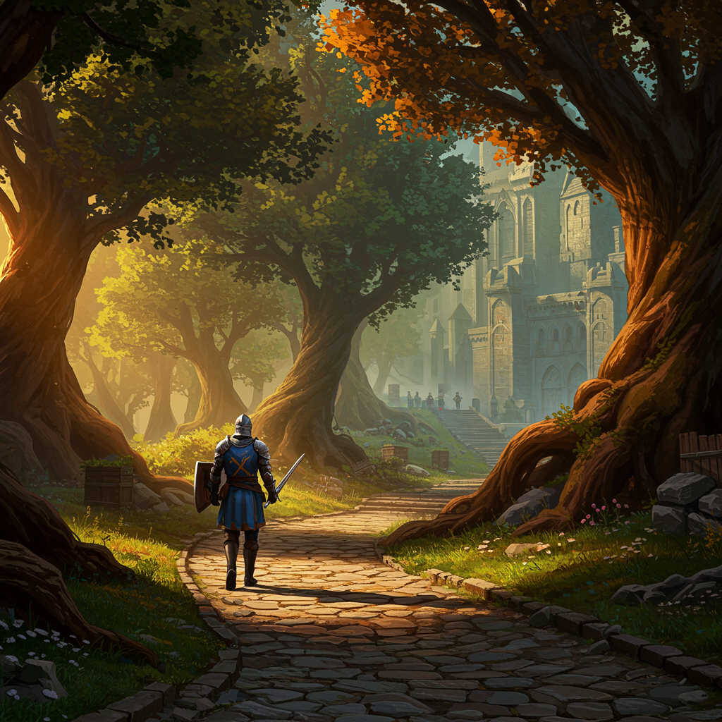 A lone knight on a quest, traversing sprawling medieval landscapes, captured in vibrant digital art. The scene depicts a richly detailed fantasy world, where the knight's armor glistens under cinematic lighting. The atmosphere is drenched in medieval ambiance, with every intricacy of the scene meticulously rendered to create a visual masterpiece. The artistic depiction is evocative of an RPG setting, where every element from the towering trees to the cobblestone paths is portrayed with exceptional detail, inviting the viewer to step into this enchanting realm.