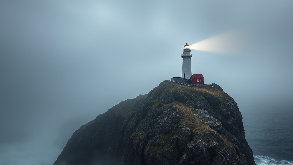 A lone lighthouse stands steadfast on the edge of a rugged cliff, its beam cutting through the dense fog and illuminating the turbulent sea, a beacon of hope guiding weary sailors safely homeward.