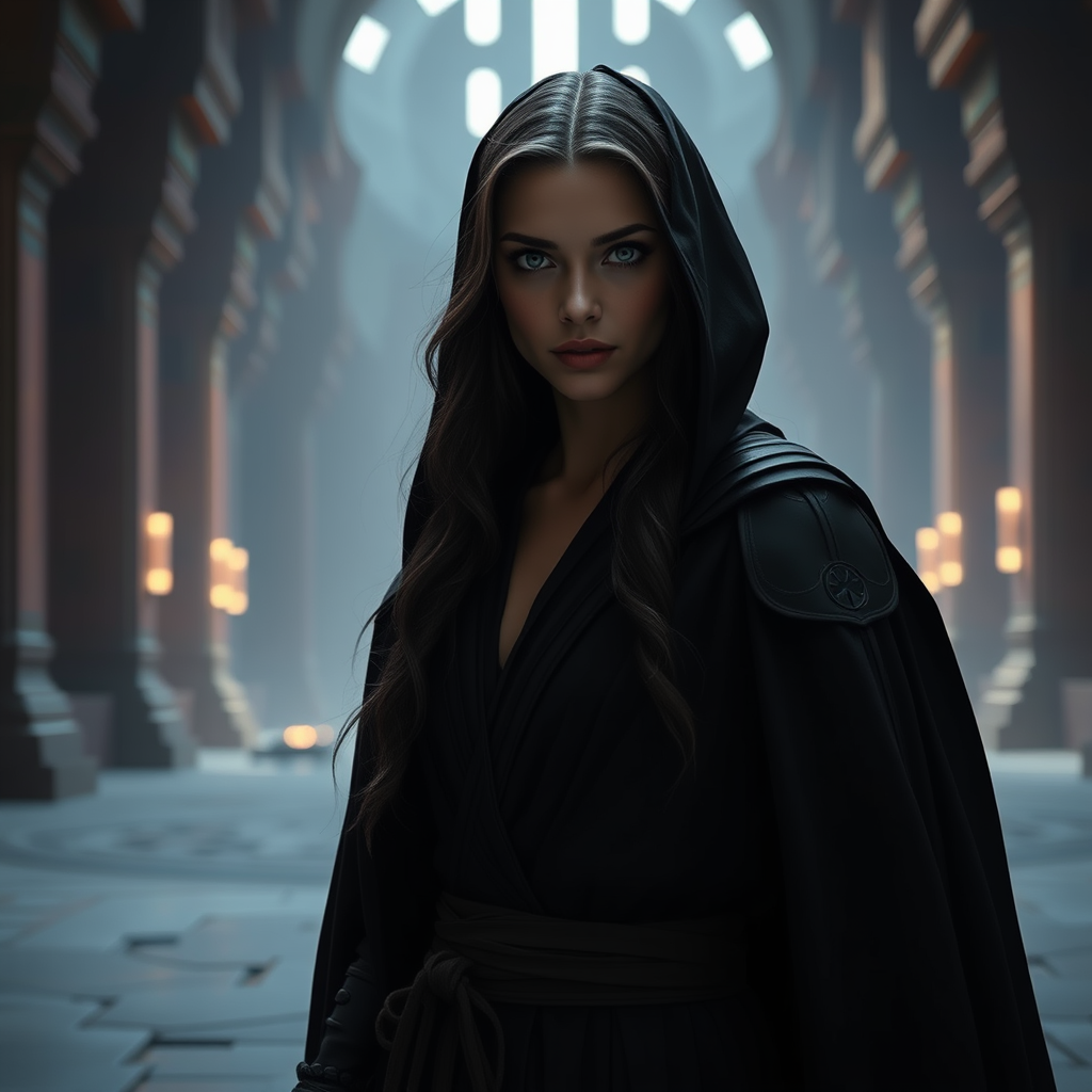 A lone, mysterious woman stands confidently in a Star Wars temple, clad in intricate dark robes that flow elegantly around her. Her symmetrical eyes are intense and captivating, framed by dramatic, moody lighting that highlights the flawless hyperrealism of her features. In this high-definition, ultra-detailed scene, the photography captures her full body in a dynamic pose, illuminated by a unique blend of cinematic, natural, and studio lighting effects. The environment offers a stunning backdrop with depth of field and global illumination, enhancing the depth and richness of the composition. The sharp focus and insane details come together in a hyper-detailed, beautifully color-graded scene, achieved with advanced ray tracing and physics-based rendering techniques. She portrays the essence of a Sith Lord, evoking a sense of power and mystery, captured through a wide-angle lens with cinematic color grading. The scene is immersive, with volumetric lighting and soft shadows adding to the overall ambience, while expertly executed post-processing creates a clean, vibrant, and photorealistic finish.