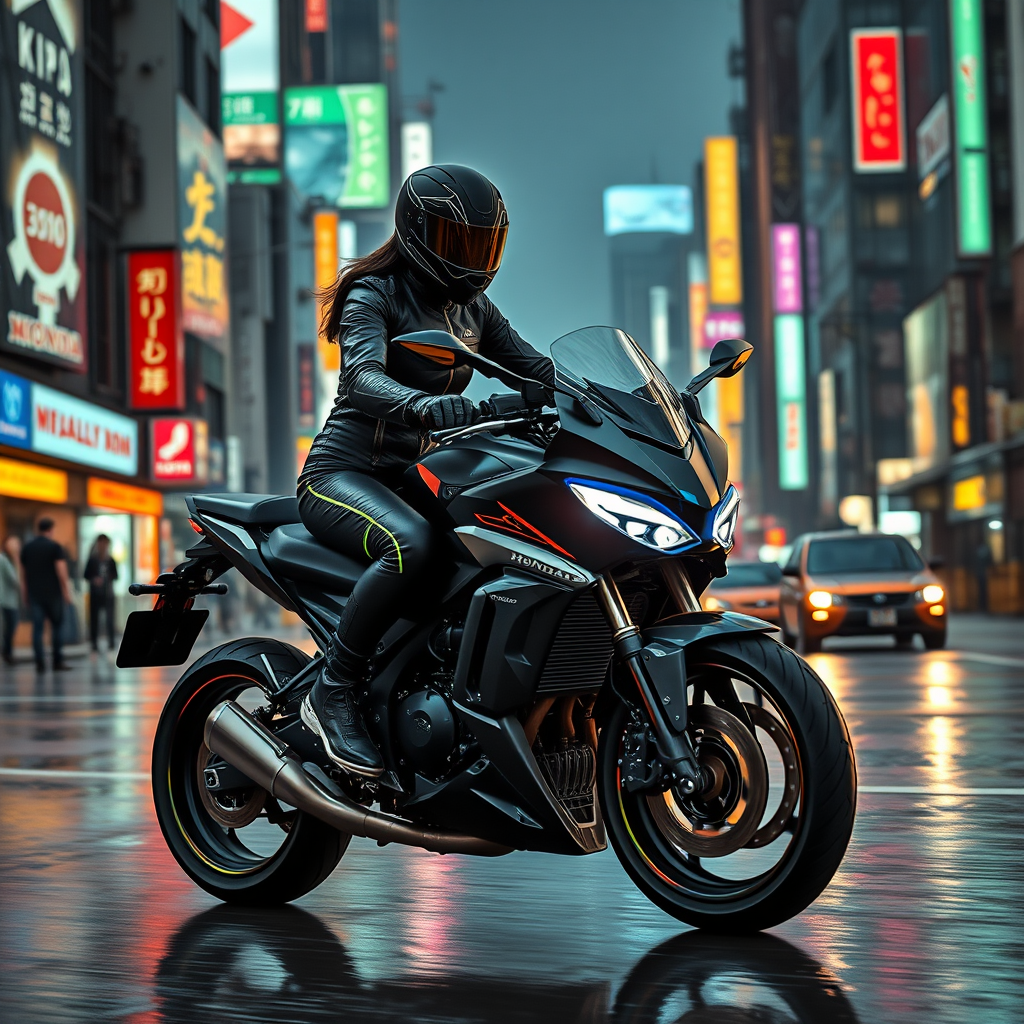 A lone rider clad in a sleek black leather jacket with neon green accents rides a matte-black Honda Valkyrie motorcycle adorned with mechanical alloy fins and pulsing LED blue accents down the rain-soaked streets of Neo-Tokyo's industrial twilight district, her helmet's tinted visor glinting with humidity as she weaves through a sea of holographic advertisements and retrofuturistic skyscrapers surrounded by the constant hum of flying cars and the distant ominous glow of the city's proliferation of sprawling Undercity Neon Strips emanating from the abandoned infrastructure deep beneath the streets.