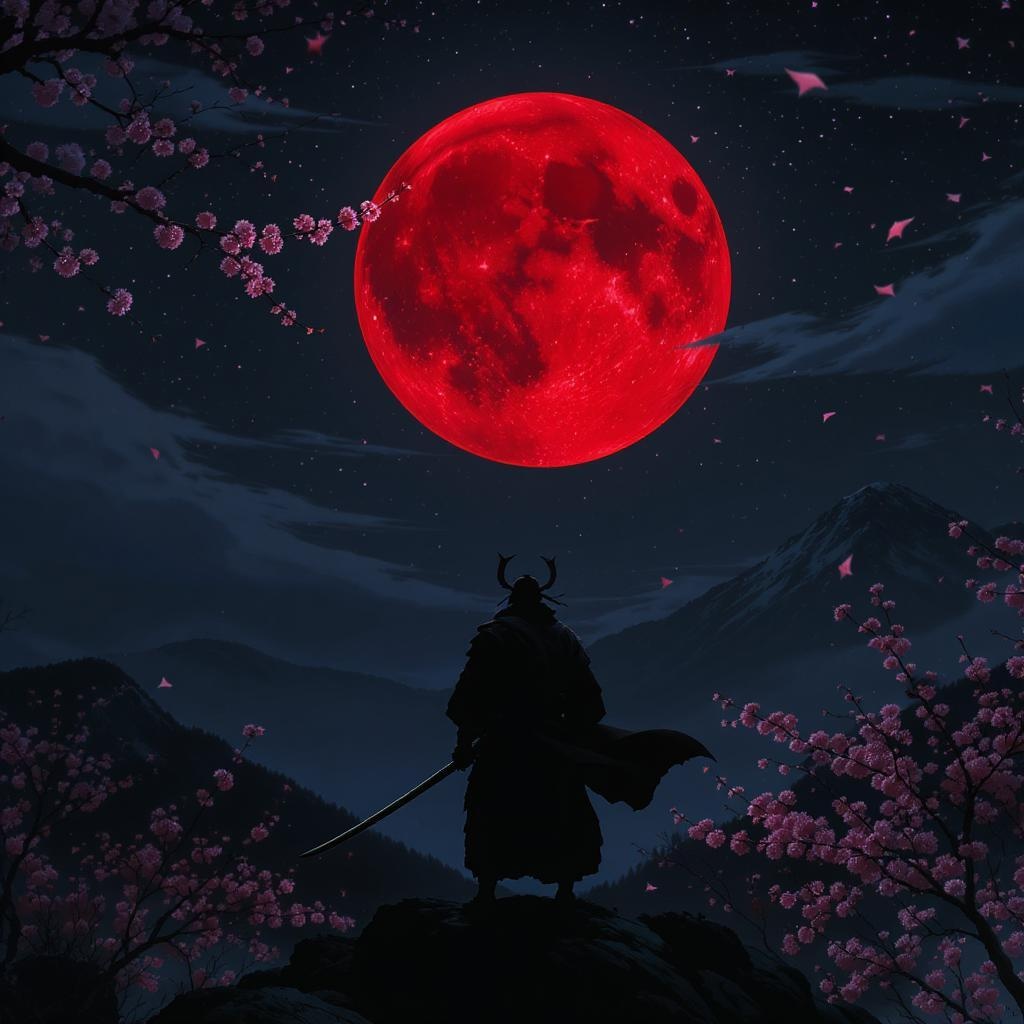 A lone ronin stands on a Japanese mountain top, his silhouette stark against the blood-stained moon that casts an eerie red glow over the landscape. Cherry blossoms flutter in the breeze, their delicate beauty contrasting the ronin's brooding presence. His eyes are a storm of anger and sadness, reflecting a lifetime of battles fought and lost. The night is thick with emotion, as the wind carries whispers of past regrets and unfulfilled vows. The scene is a haunting blend of solitude and intensity, capturing the ronin’s inner turmoil against a backdrop of ethereal natural beauty.