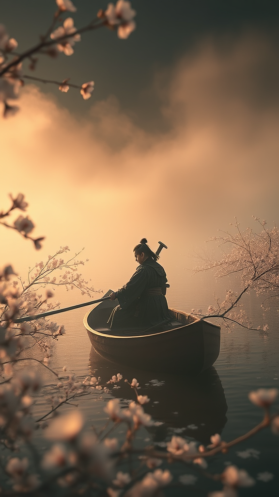 A lone samurai gracefully poised in a boat drifting amidst a sea of delicate cherry blossoms, surrounded by lush, fairycore scenery that exudes a dreamlike quality. The scene is imbued with ultra-detailed intricacies, bathed in dramatic ambient light, casting an ethereal glow reminiscent of works by Greg Rutkowski and Magali Villeneuve. A soft, persistent fog shrouds the background, heightening the epic realism of the moment. The composition is hyper-detailed, with cinematic elements seamlessly woven in. Gentle rim lighting highlights the serene determination on the samurai's face, while the muted colors create a harmonious balance with the vibrant cherry blossoms, evoking a sense of tranquil beauty in this enchanting tableau.