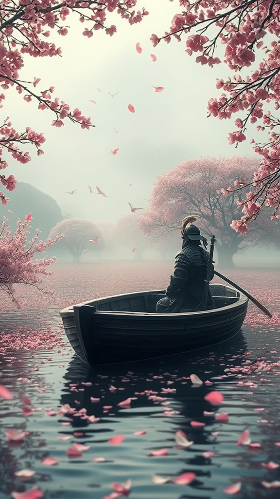 A lone samurai in a gently swaying boat amidst a sea of cherry blossom petals, surrounded by lush, enchanting scenery; the scene captures the essence of fairycore with ultra-detailed and intricate beauty. Rendered with the distinct styles of Greg Rutkowski and Magali Villeneuve, the landscape is bathed in dramatic, ambient light with a gentle, foggy background creating an epic, realistic atmosphere. The composition features hyper-detailed, cinematic elements with soft rim lighting accentuating the muted colors of the scene while delicate cherry blossom petals drift softly around the samurai, imbuing the moment with an ethereal, dreamlike quality, yet subtly enhanced by ambient whispers of distant songbirds and the mellow reflection of morning light on rippling water.