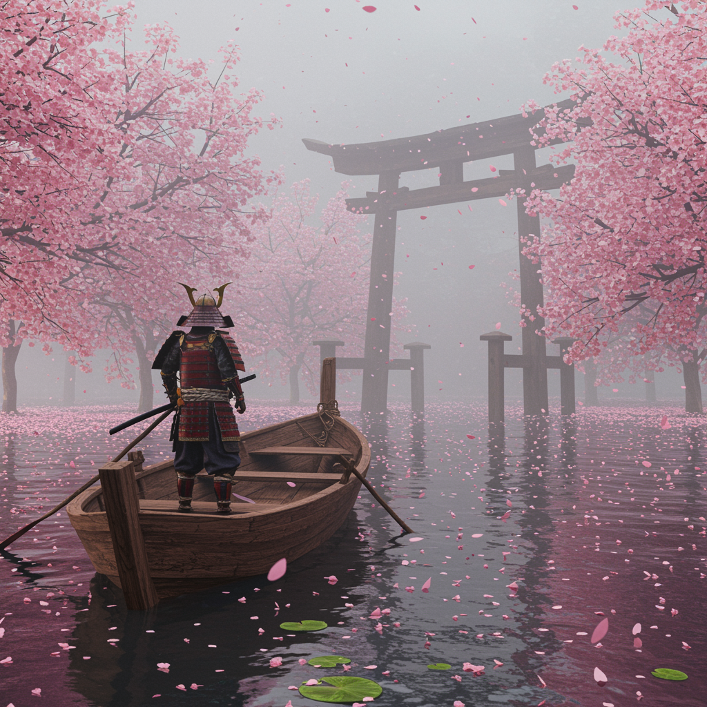 A lone samurai stands poised in a traditional wooden boat as it gently drifts among a sea of cherry blossoms, their delicate pink petals creating a vibrant, ethereal landscape. The lush scenery captures the essence of fairycore fantasy, with intricate details woven into every element. Dramatic ambient lighting casts a soft glow on the scene, highlighting the samurai's ornate armor and shimmering katana. The foggy background blends seamlessly with the muted colors of the setting, crafting an atmosphere that is both epic and realistic. Each blossom and ripple in the water is rendered with hyperdetailed precision, evoking a cinematic quality reminiscent of an artwork by Greg Rutkowski and Magali Villeneuve. Rim light encircles the samurai, enhancing the mystical mood of this high-resolution masterpiece.