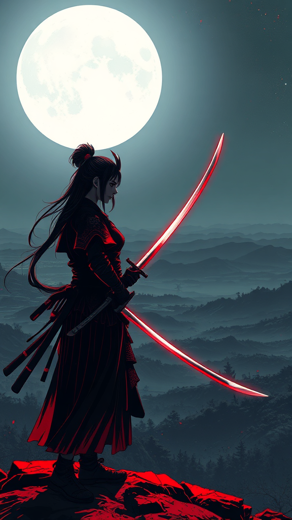 A lone samurai stands under the moonlit sky, her gleaming sword reflecting the pale light. Screen-printed details bring her figure to life against a backdrop of sprawling, epic fantasy landscapes. The scene is infused with comiccore elements, where exaggerated expressions and dynamic lines depict her poised stance. Light black and red tones dominate, casting an eerie glow reminiscent of firecore aesthetics. Halloween motifs subtly weave through the scene, as shadows dance around her in sinister forms. In the distance, ominous horizons stretch beyond, hinting at a world filled with untold mysteries and ancient battles.