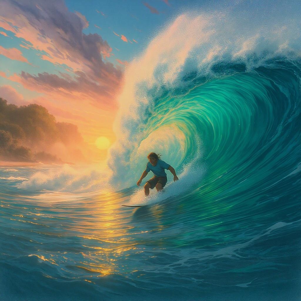 A lone surfer rides a majestic wave off the coast of Bali, capturing the ethereal essence of a Miyazaki film. The ocean swirls with vibrant shades of turquoise and emerald, reminiscent of the lush landscapes in Nausicaa of the Valley of the Wind. The scene embodies the adventurous spirit and serene beauty akin to Breath of The Wild, where the sky is painted in warm hues as the sun sets, casting a magical glow over the horizon.