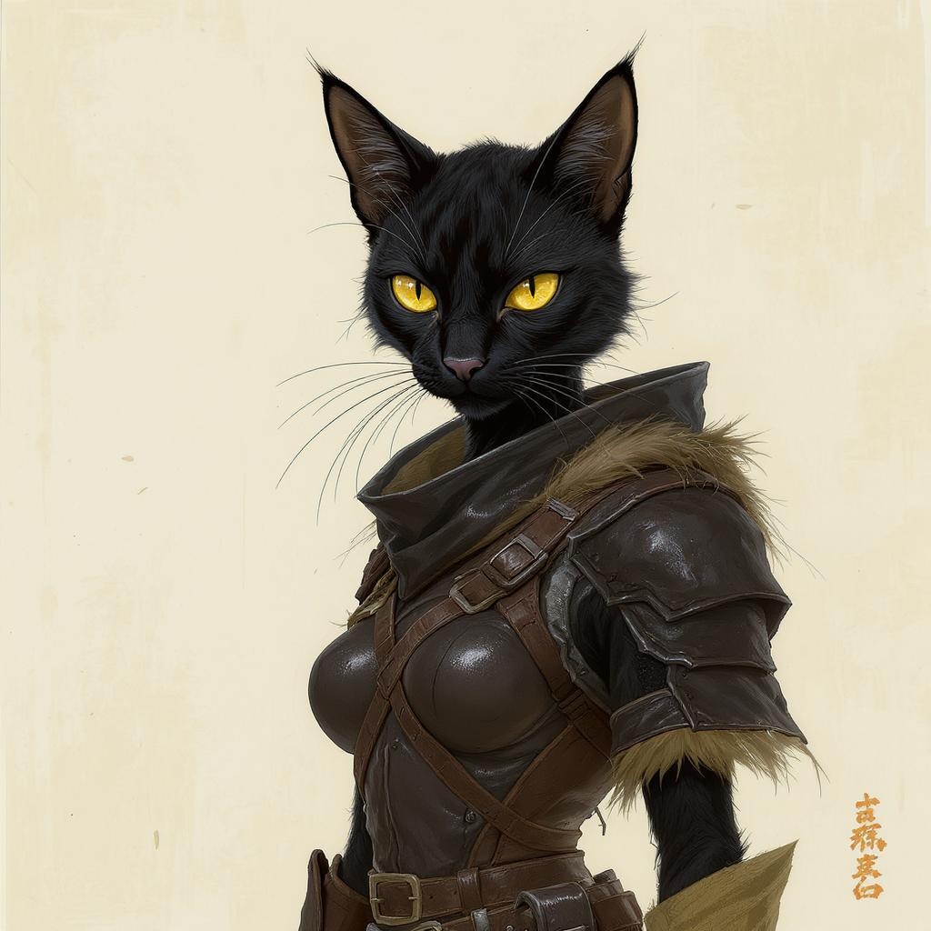 A lone tabaxi stands in a cowboy shot, the cat-like girl showcasing sleek black fur and piercing yellow eyes that gleam with intelligence. Her animal ears twitch slightly as she surveys her surroundings. Clad in rugged leather armor, she exudes the aura of a skilled rogue or thief. Her animal nose is subtly pointed, accentuating her feline features. The setting is minimalistic, with a simple backdrop allowing the hues of yellow and white to take center stage, highlighting her mysterious and adventurous essence.