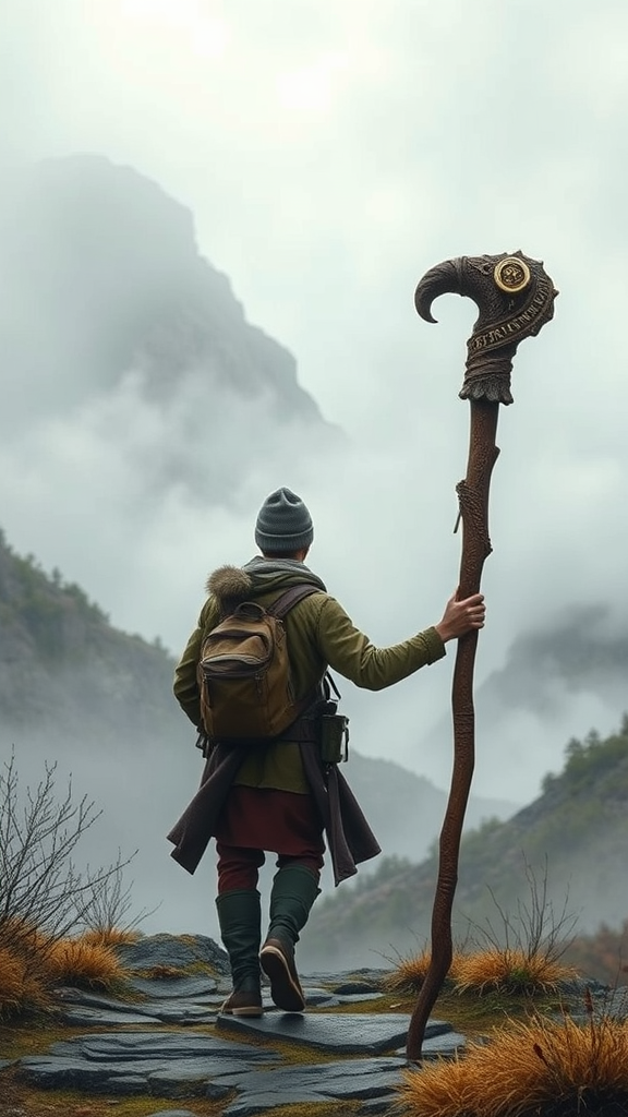 A lone traveler, Johnny Wanderer, roams through misty landscapes, clutching a mysterious walking stick engraved with tales of old.