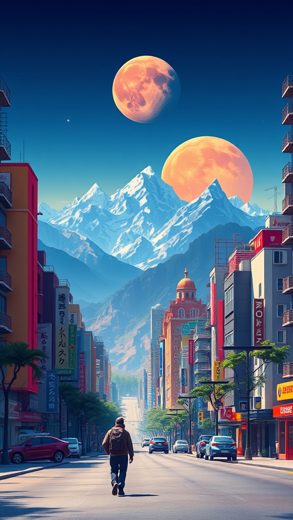 A lone traveler strolls down a bustling city street, surrounded by vibrant skyscrapers, as majestic mountains dominate the horizon. In the sky, an enormous orange-hued planet and a colossal moon cast an ethereal glow over the scene. The landscape is brought to life in a stunningly intricate illustration, inspired by Beeple, with vivid color palettes and intricate geometric lowpoly art, blending natural beauty with urban splendor.