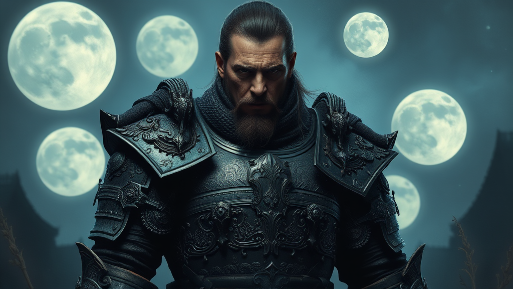 A lone warrior clad in intricately designed heavy armor stands with a cold expression, gazing directly at the viewer. The sublime artwork captures a striking 8k wallpaper masterpiece, showcasing exquisite details of the warrior's gear under the light of multiple moons. The setting imbues a mystical atmosphere, casting soft shadows across the warrior's face and armor. Despite the somber mood and the cool glow of the moonlit night, the warrior's presence commands attention. Even though imperfections like skin blemishes and age spots are visible, they add depth and realism to this captivating painting. The portrayal is utterly realistic, skillfully avoiding common pitfalls like distorted anatomy, poorly rendered hands, or digital artifacts. The focus remains sharp, ensuring each element, from the etched armor to the warrior's steady gaze, contributes to an unforgettable visual experience.
