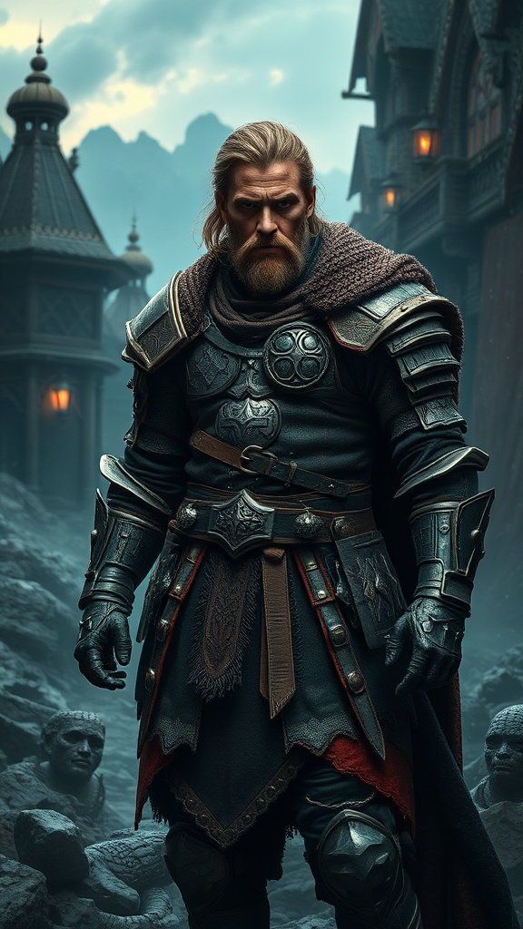 A lone warrior stands in a heroic pose, set against a medieval fantasy landscape, with intricate details surrounding him. The scene is illuminated by cinematic lighting, enhancing every detail of his battle-worn armor and determined expression. His eyes reflect a lifetime of adventures, each a story of its own. The ambiance is rich with the allure of role-playing games, inviting you into a world of DnD-inspired adventures. Everything is captured in ultra resolution and ultra quality, showcasing the craft of artistry. Despite the fantastical setting, the scene maintains integrity, free from abnormalities, with a focus on masculine presence and heroic narrative.